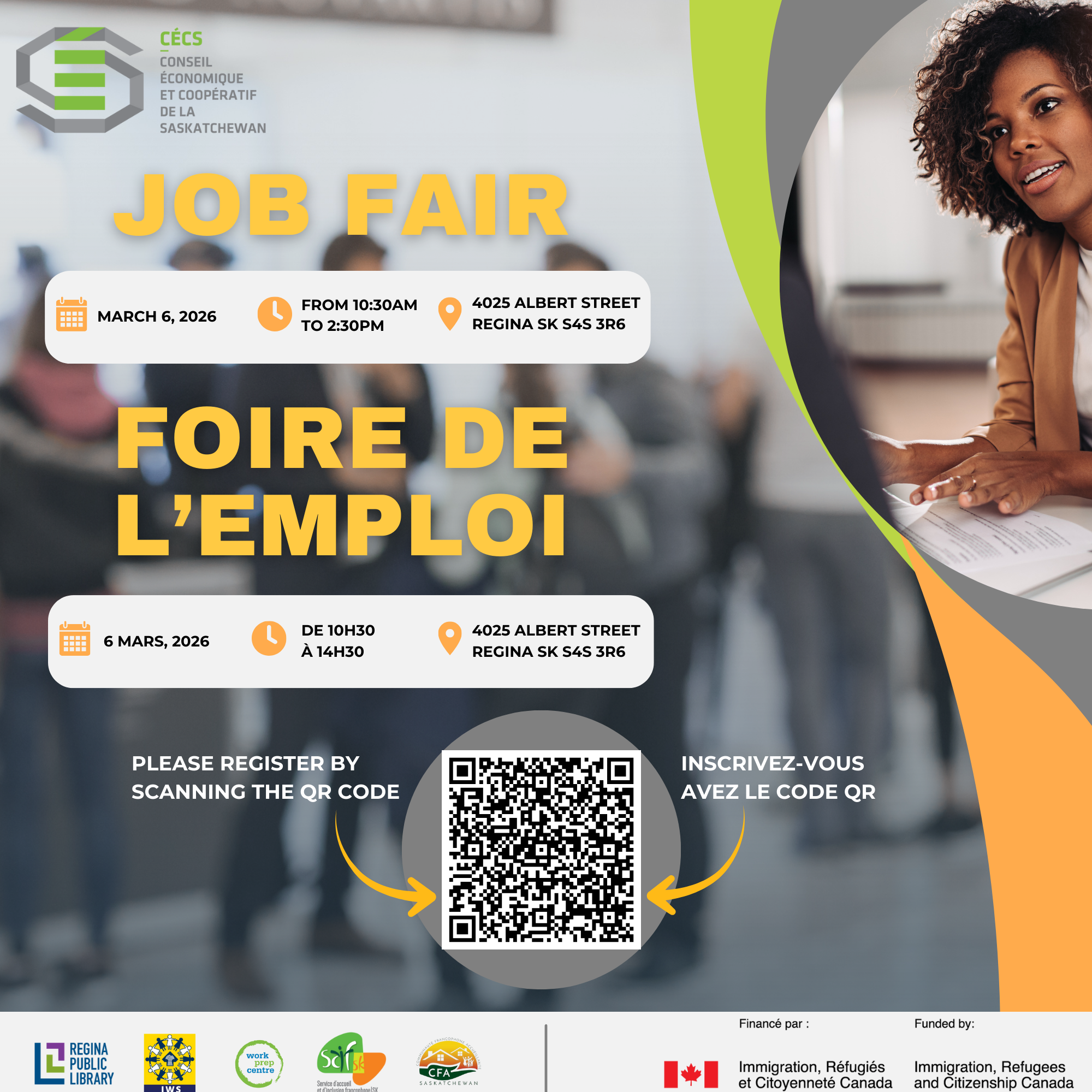 Le Conseil économique et coopératif de la Saskatchewan (CÉCS), en collaboration avec ses partenaires, invite les employeurs de la province à participer à deux grandes foires de l’emploi bilingues qui se tiendront en mars 2026 à Regina et à Saskatoon.